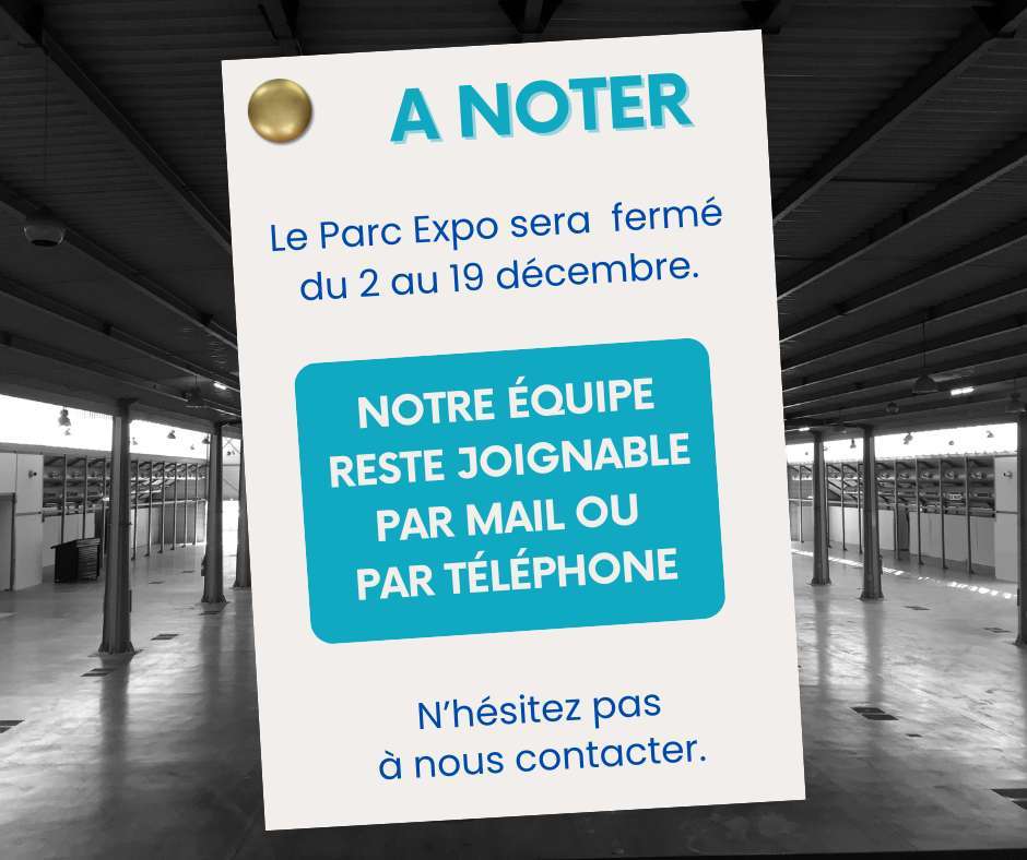 Le Parc Expo sera fermé du 2 au 19 décembre mais notre équipe administrative reste joignable par mail ou par téléphone.